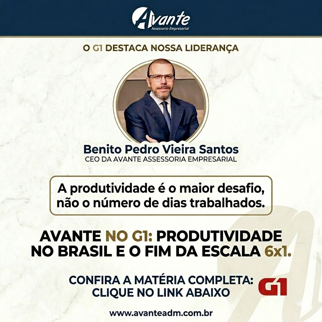 A Eficiência Além da Jornada de TrabalhoA discussão sobre a escala 6×1 e a produtividade nacional ganhou novos contornos com a participação do nosso CEO, Benito Pedro Vieira Santos, em recente reportagem do G1. Em um cenário onde o Banco Central aponta um crescimento modesto na produtividade brasileira, a Avante Assessoria Empresarial reafirma seu posicionamento:…